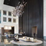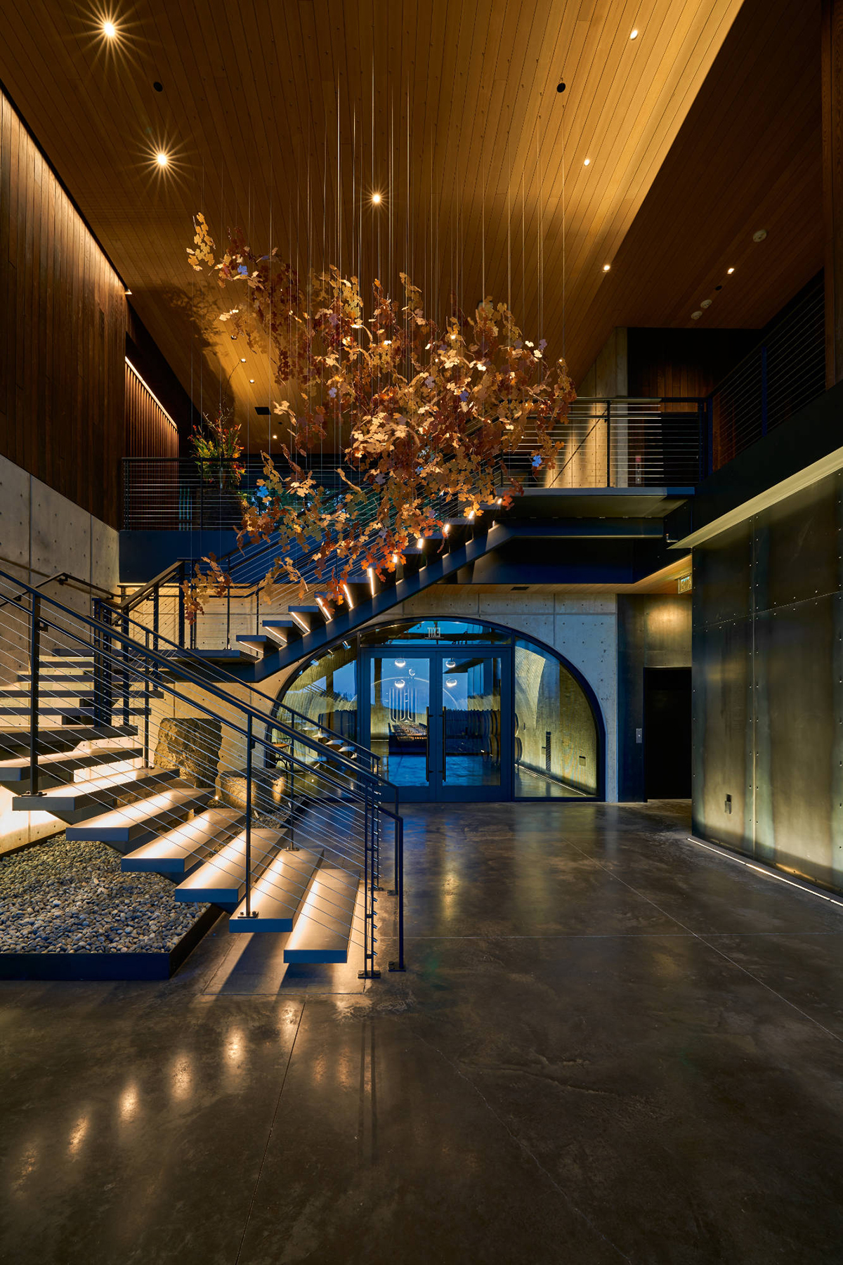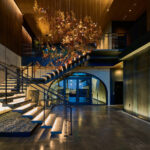Arboreal, meaning ‘living in trees’, brings beauty and harmony of the natural environment into interior spaces. The dense foliage elements, cut from satin and polished aluminum, cast a unique mix of prickled light and shadow around a room, emulating filtered sunlight cast from the native Australian Eucalypt. This design is suspended from a mirror ACM ceiling plate and lit by LED bi-pins.