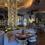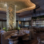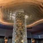 Our take on Stanley Kubrik’s Monolith, Babel is an exotic example of contemporary floor lighting. Made from a mixture of transparent acrylic and aluminium hexagonal panels, each panel interlocks to form a pillar-like structure which spirals up from the ground towards the ceiling. The hexagonal pattern is also inspired by the scales of a lizard or snake sunning on a large rock in the Australian outback. Warm light gleams through the pillar from LED bi-pins and reflects off the gold hexagons throughout the room.