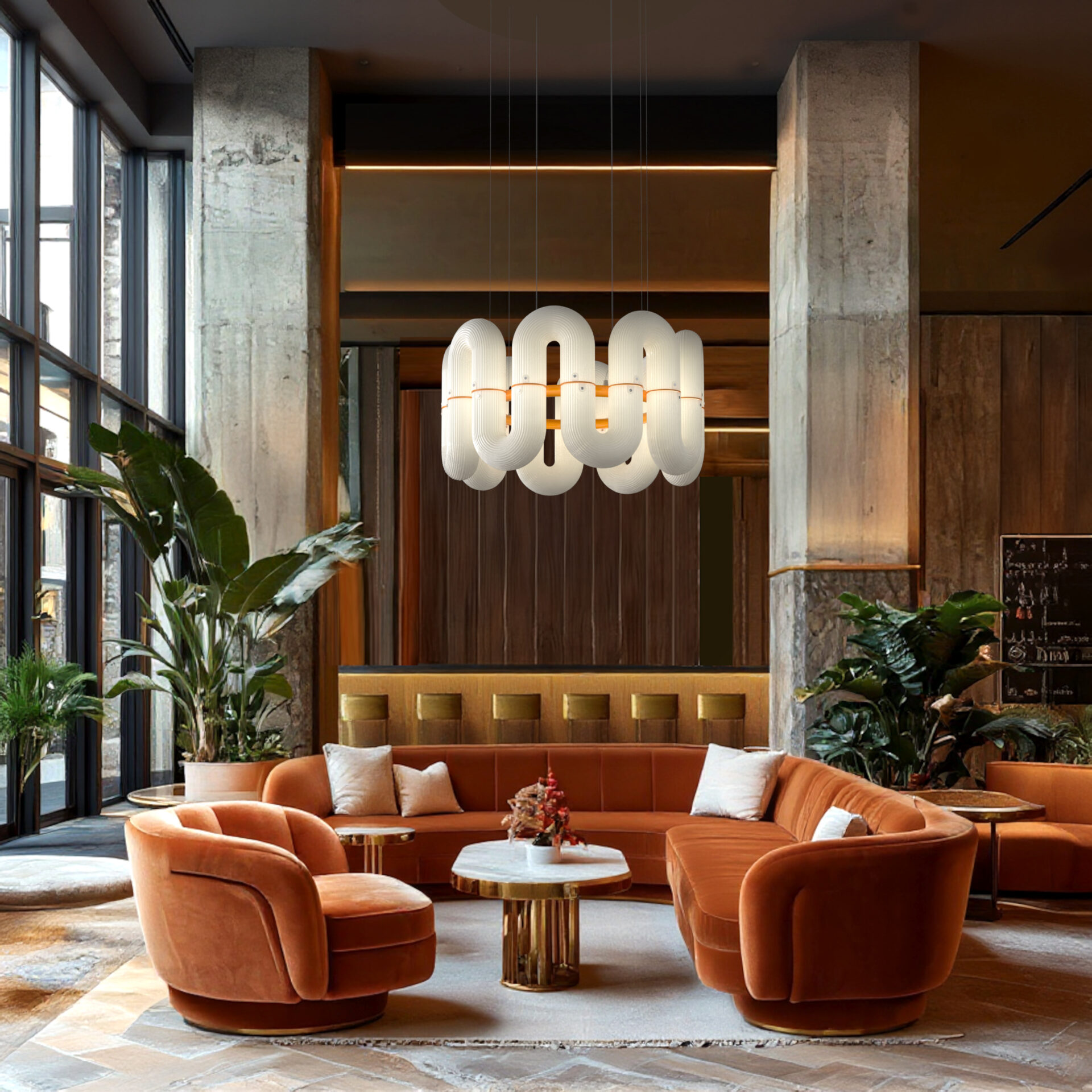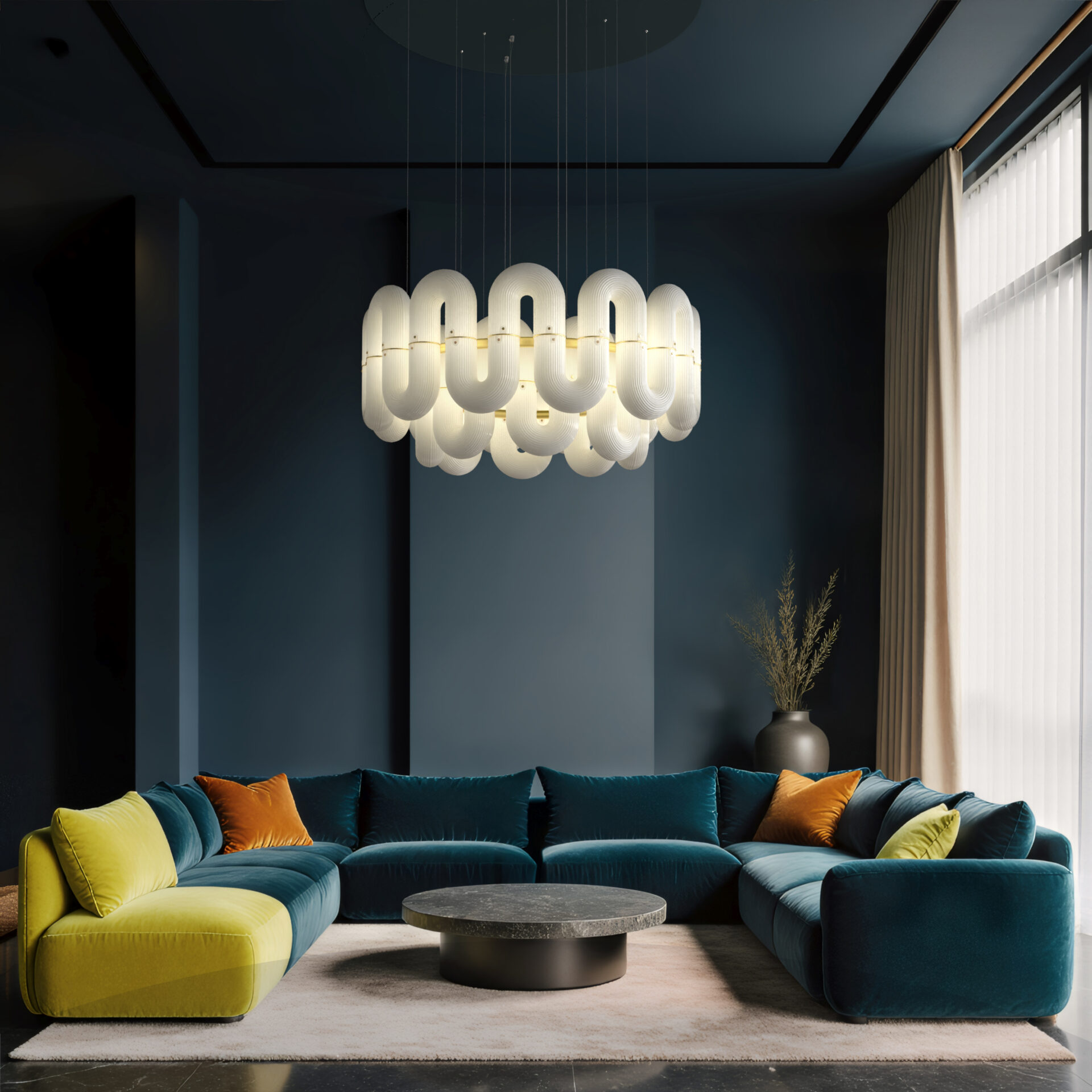 Electric Groove channels the bold, playful energy of Verner Panton’s iconic textile designs, translating curved, rhythmic forms into a luminous sculptural fixture. Two tiers of frosted, reeded glass arcs interconnect along a sleek metal brace, creating the impression of a flowing, electrified current. With its dynamic geometry and elevated presence, Electric Groove infuses any interior with movement, vibrancy, and retro-modern spirit. This fixture is also offered in a single tier, budget friendly version.