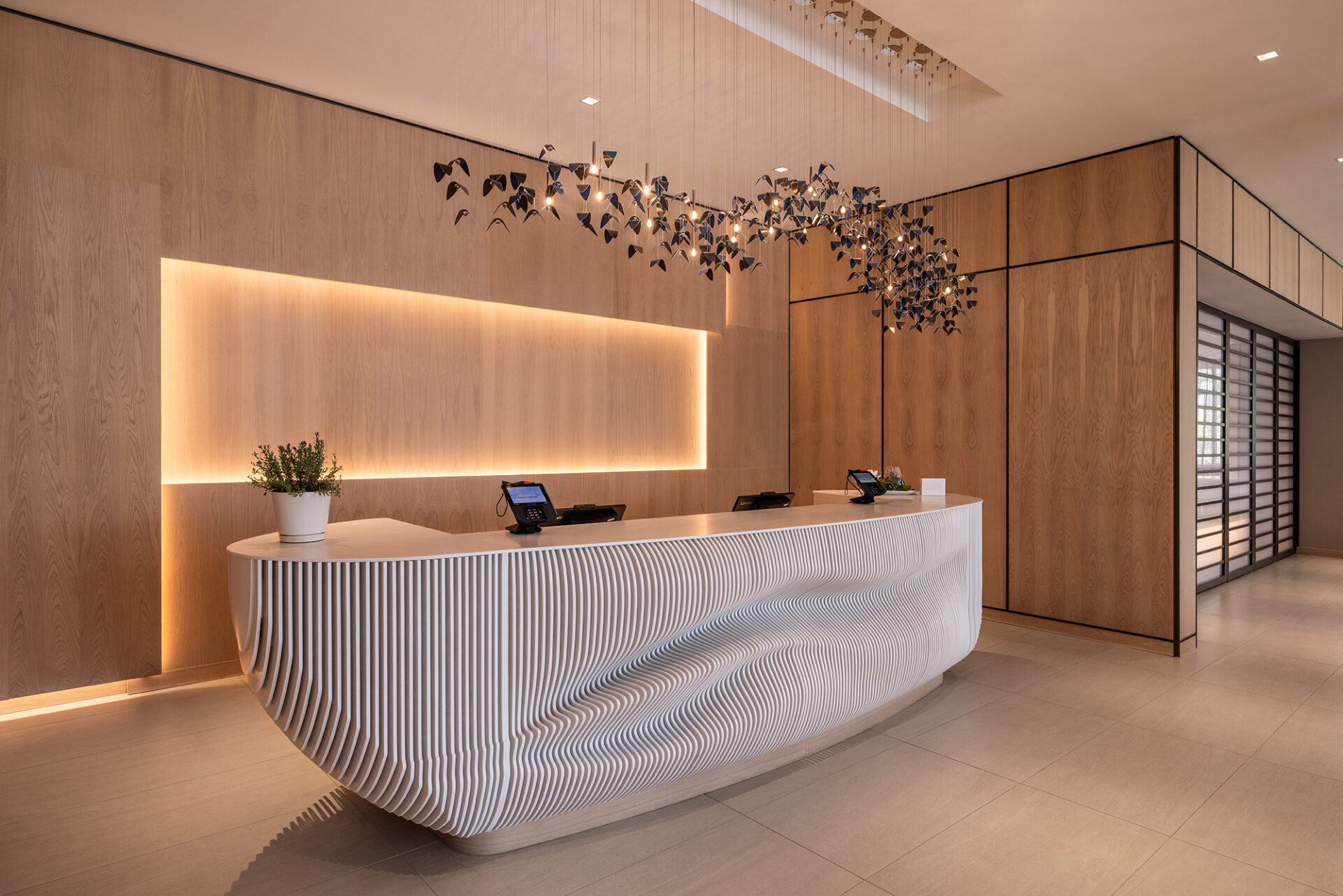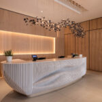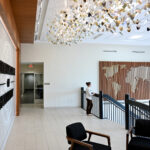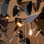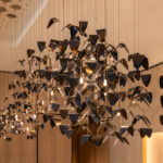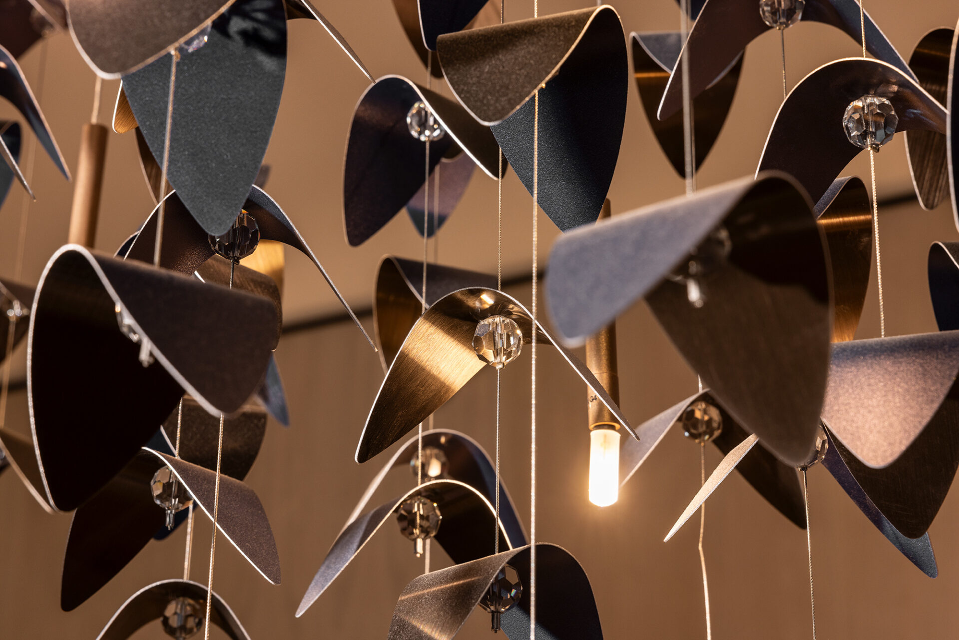 Kite Formation is a cluster of abstract miniature paragliders that create an undulating wave formation. Each laser-cut kite element is adorned with crystals to sparkle like the sun shines in the sky. Available in a gold finish (cover image) or patina finish (second image), you can customize the size and density to span the length of your interior for maximum impact. The elements are suspended on stainless steel cables from a mirror ACM ceiling plate and lit by LED bi-pins. Fly high with this one.